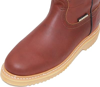 This pull on Leather work boot is rugged, reliable and built to last. The Nubuck leather boot is constructed with a heavy duty durable rubber sole for heavy construction work. They ensure durability and flexibility with is double stitched soles. The inside padded insole cushion allows for all day comfort. The leather stitched pull straps make for easy pull on. The soft toe round toe profile is classic and comfortable. The Shaft Measures approximately 9 inches and its heel measures approximately 1 inch. The leather stitched pull straps make for easy pull on. The inner lining is leather adding nice quality detail to this well constructed work boot. Made In Mexico.
