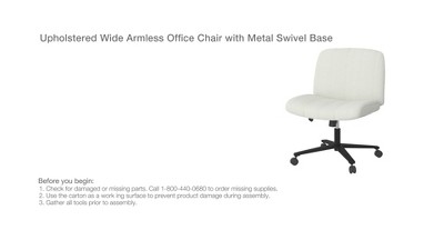 Highlights Upholstered wide armless office chair Wooden frame Padded seat and back Casters at the base Adjustable height 32.87in H x 30.12in W x 30.12in D Description Upgrade your home office space with this Upholstered Armless Office Chair with Metal Swivel Base from Room Essentials™. This upholstered, armless office chair is crafted with a wooden frame and features crisscross fabric upholstery with a padded seat and back for comfy seating. The swivel mechanism lets you rotate the chair 360 degrees, while the casters at the base allow for easy maneuverability. Plus, you can adjust the height with a lever to customize the chair to your liking. Room Essentials™: Everyday Value