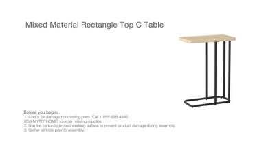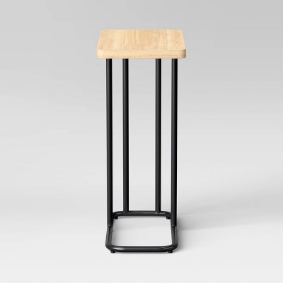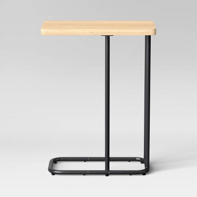Highlights Mixed-material C table Natural brown and black hues Wood-finish rectangular top Black powder-coated steel frame 24in H x 10in W x 18in D Description Add space-saving functionality to your home with this Mixed-Material Rectangle-Top C Table from Room Essentials™. Standing at a height of 24 inches, this C table has a wood-finish rectangular top in natural brown and black powder-coated steel legs and base. Easy to slide underneath your sofa, couch or bed, it makes your snacks, coffee, remotes, phones, books and more easier to reach while lounging or watching TV. Plus, it can be used as an end table, couch table or bedside table without taking up extra space. Room Essentials™: Everyday Value Detailed Dimensions: Overall Width: 18.03 inches Overall Height: 24 inches Overall Depth: 10.04 inches Distance from table top to floor: 24 inches Distance from front tube to table edge : 10.04 inches